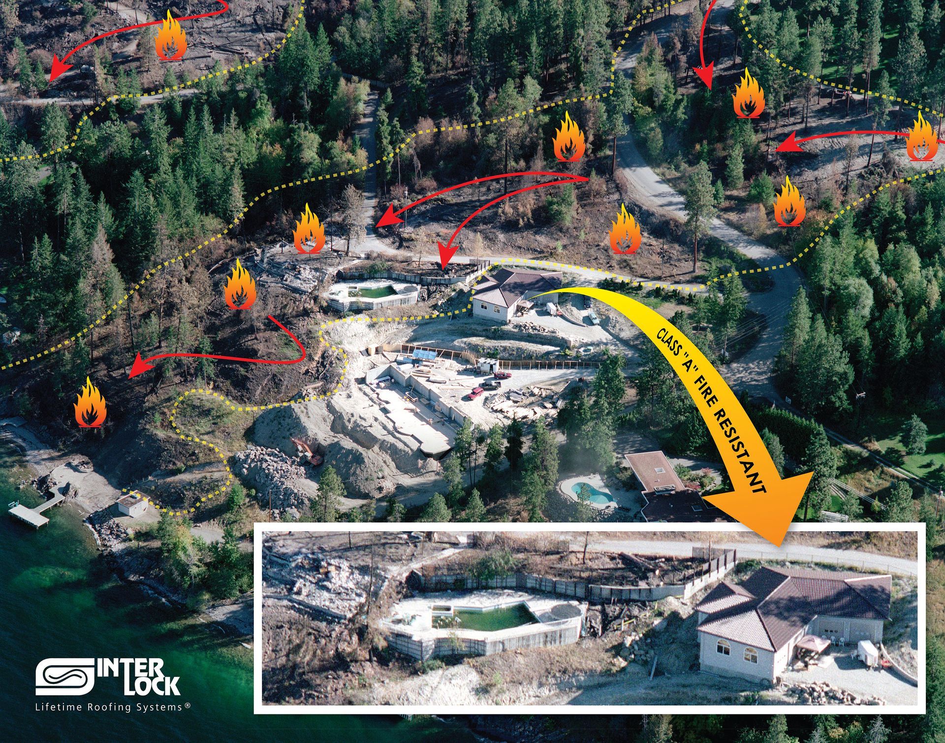 Interlock's heavy-gauge aluminum roof in combination with underlayment requirements, meets Class A fire standards, offering the maximum protection available. Unlike wood or conventional shingles, which ignite easily, aluminum roofing will not catch fire or sustain a flame. In a wildfire scenario, embers burn out on the surface of a metal roof instead of igniting it. And if a neighbouring building catches fire, a Class A metal roof can prevent flames from spreading to your home. This robust fire performance has real-life validation – as mentioned earlier, homes with metal roofs survived major fires in Kelowna and Lytton because the roofs never ignited. Choosing a Class A roof, like Interlock, gives your home a fighting chance even in the most extreme fire events.